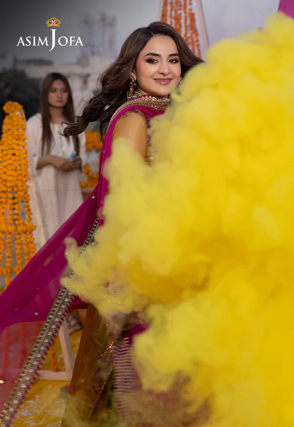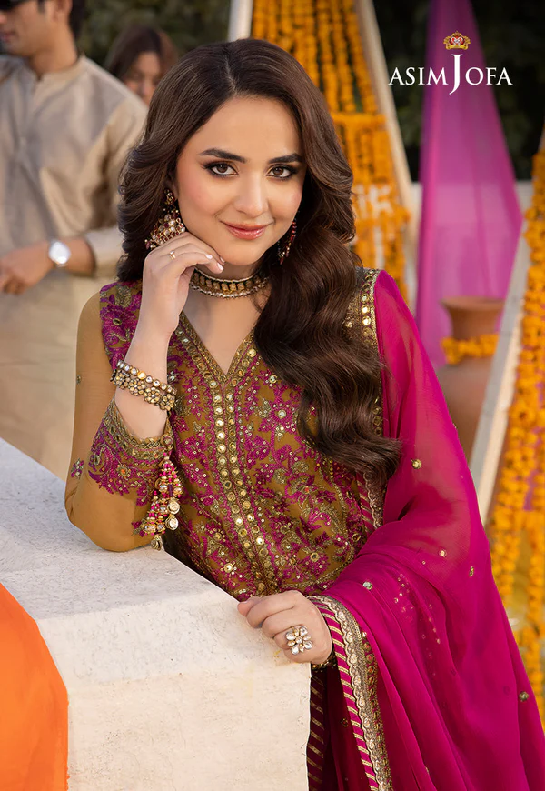Embrace Majestic Fusion with this gold mustard ensemble, a contemporary design that marries tradition with modernity. Adorned with deep magenta aari thread and stitch, the embroidered right and left panels along with the back, create a regal tapestry. The 3mm and 9mm gold sequins add a touch of opulence while the contrasting deep magenta dupatta with four-side borders completes this ensemble with a majestic flourish.