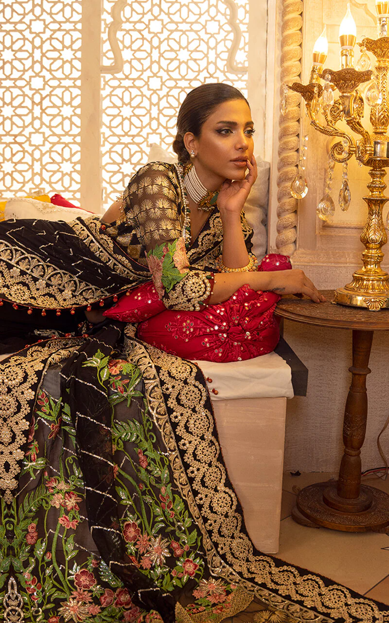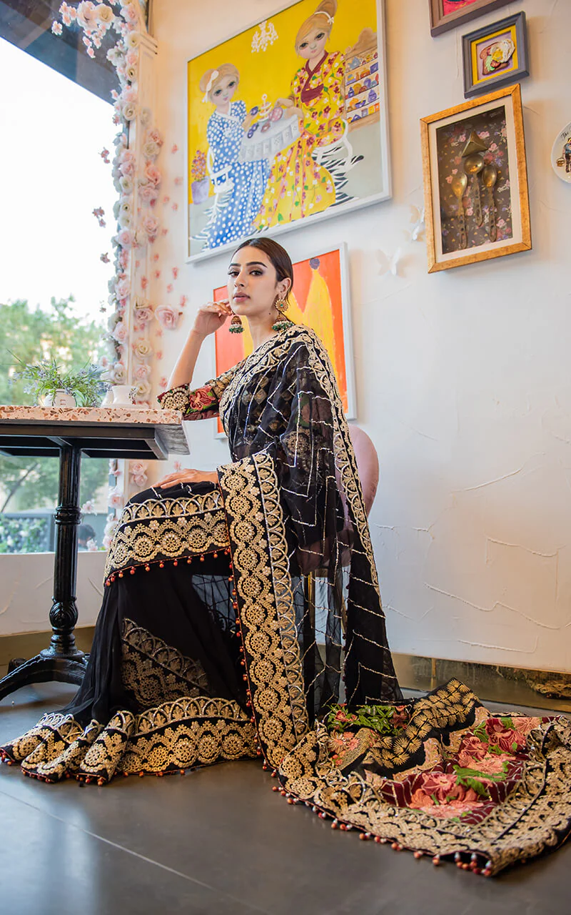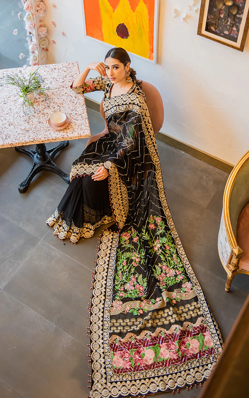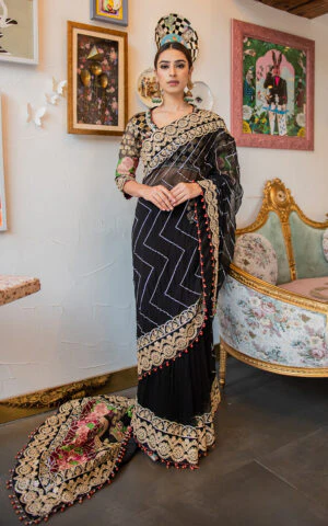 Fully Embroidered sequined sleeves on dyed organza.
