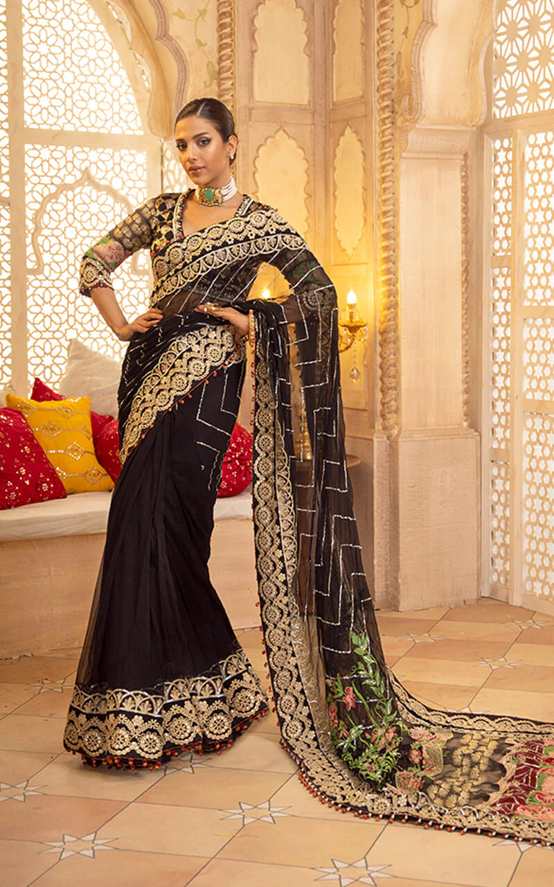 Embroidered sequined with panni on dyed chiffon saree pallu.
