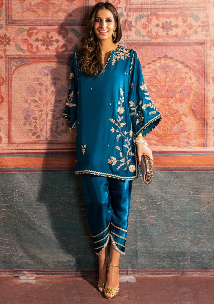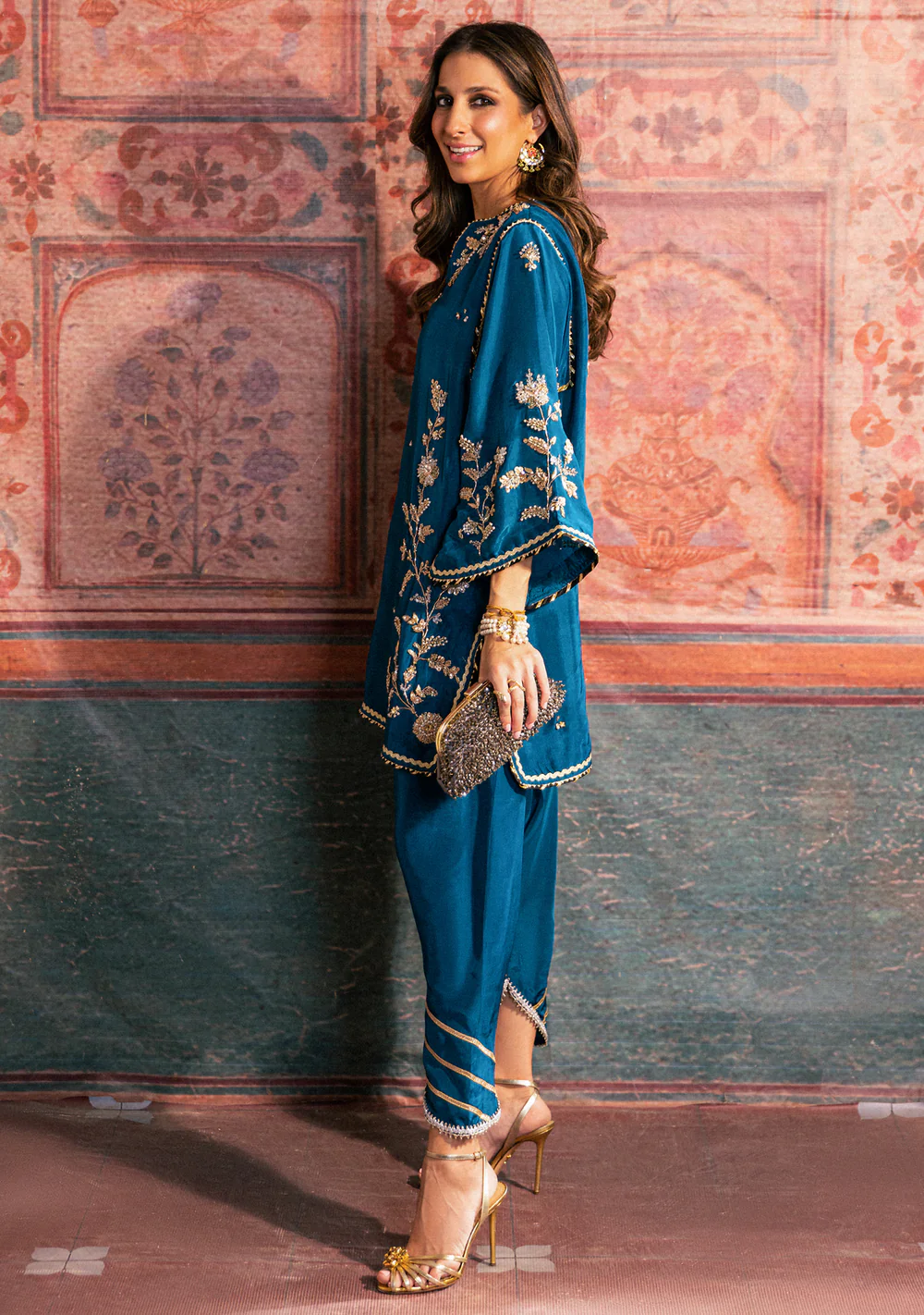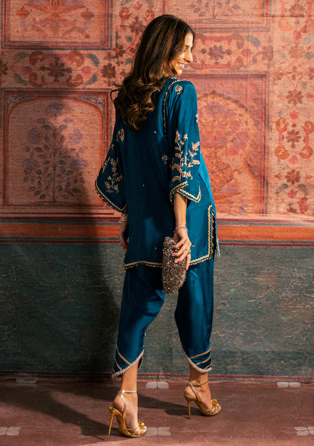 Firouzeh, the teal tassel silk oversized kurta comes with god and silver handwork detailing and is paired with a teal shalwar with gold and silver edgings.