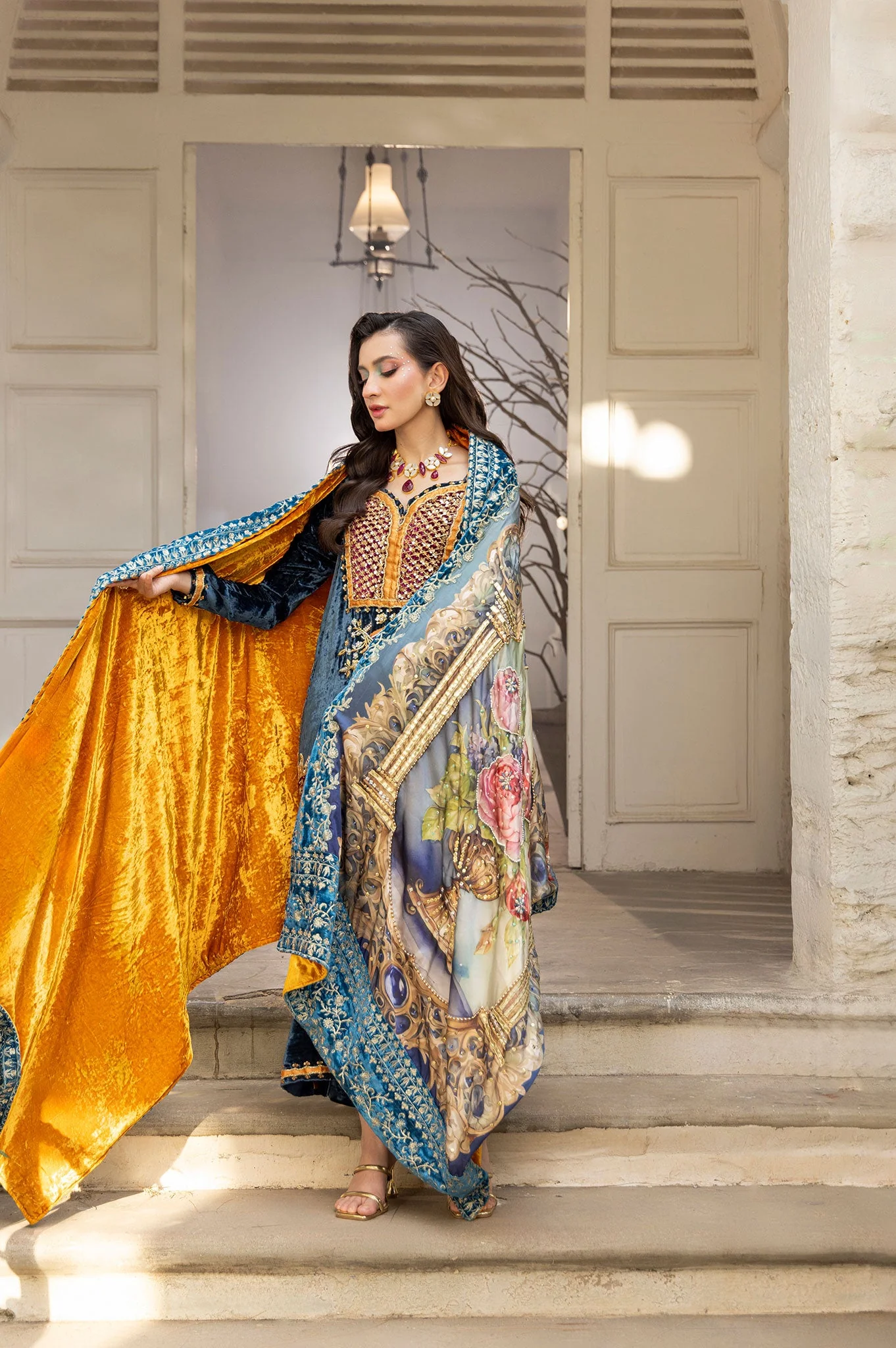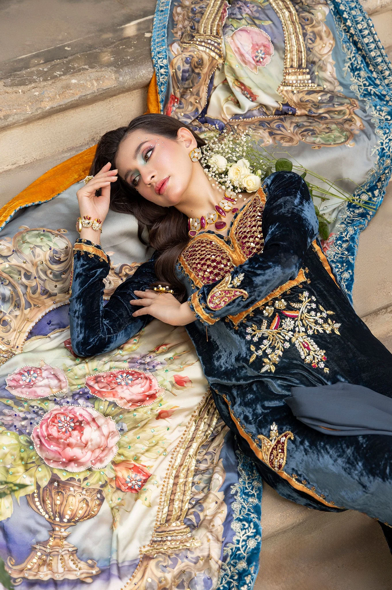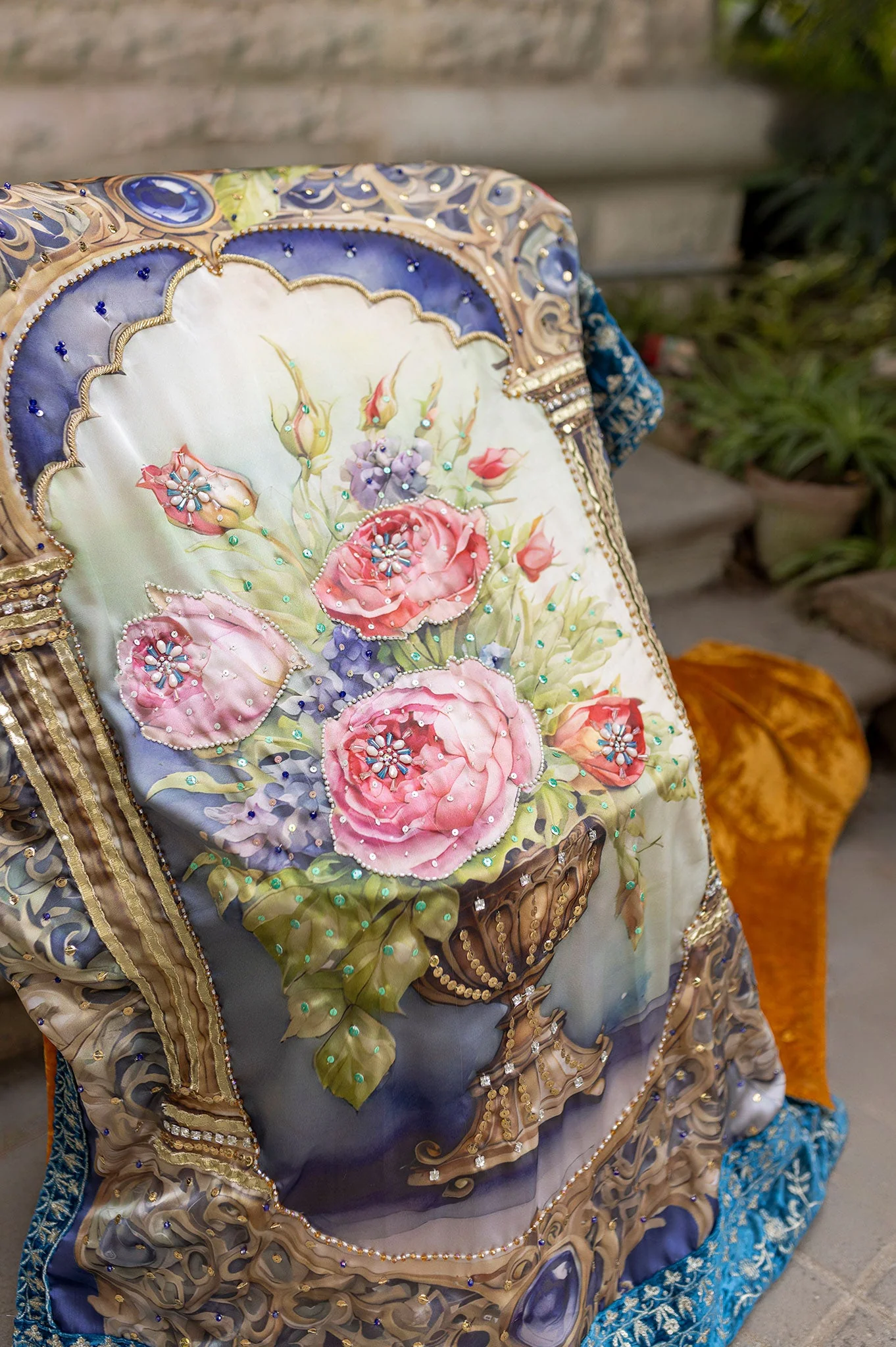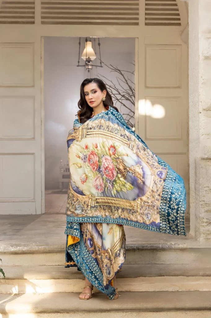 Design Details: The design showcases a harmonious mix of architectural and floral motifs, lending it a timeless charm. The light pastel tones beautifully balance the intricate, bold patterns, giving the shawl a refined and elegant appearance. The shawl is further adorned with a blue velvet embroidered border that provides a refined finishing touch, perfectly complementing the light pastel tones. This thoughtful detailing balances the intricate patterns, creating a sophisticated and elegant appearance.