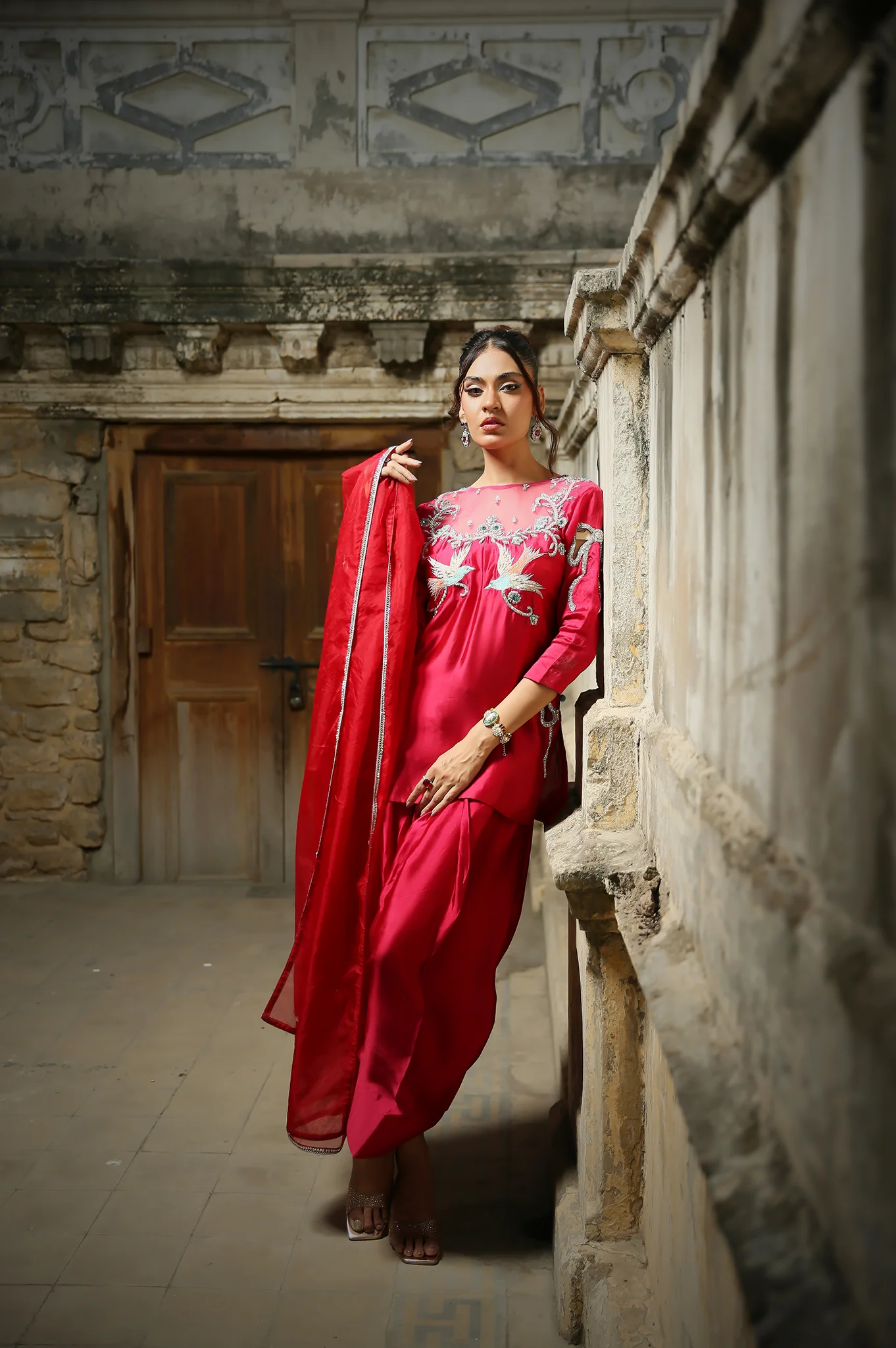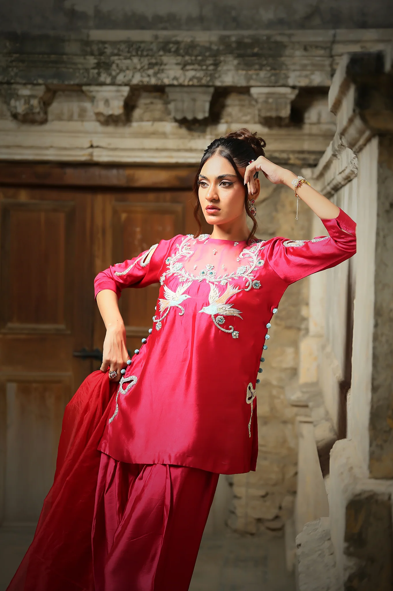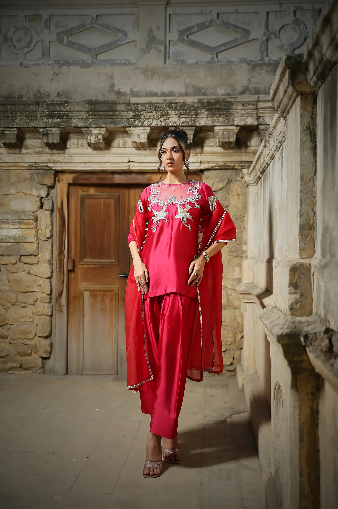 Immerse yourself in the timeless allure of Heer, a celebration of modern Short fusion cut elegance crafted in luxurious Sheesha Silk. This rich pink ensemble showcases a chic, short short-style shirt adorned with intricate floral embroidery, blending tradition with contemporary flair. The khadi shalwar offers both comfort and bold, cultural essence, while the organza dupatta adds a sheer, graceful finishing touch. The shirt’s sophisticated design features elegant fabric buttons along the side and intricate embellishments that highlight its vibrant tone. Whether you’re attending festive occasions, formal gatherings, or weddings
