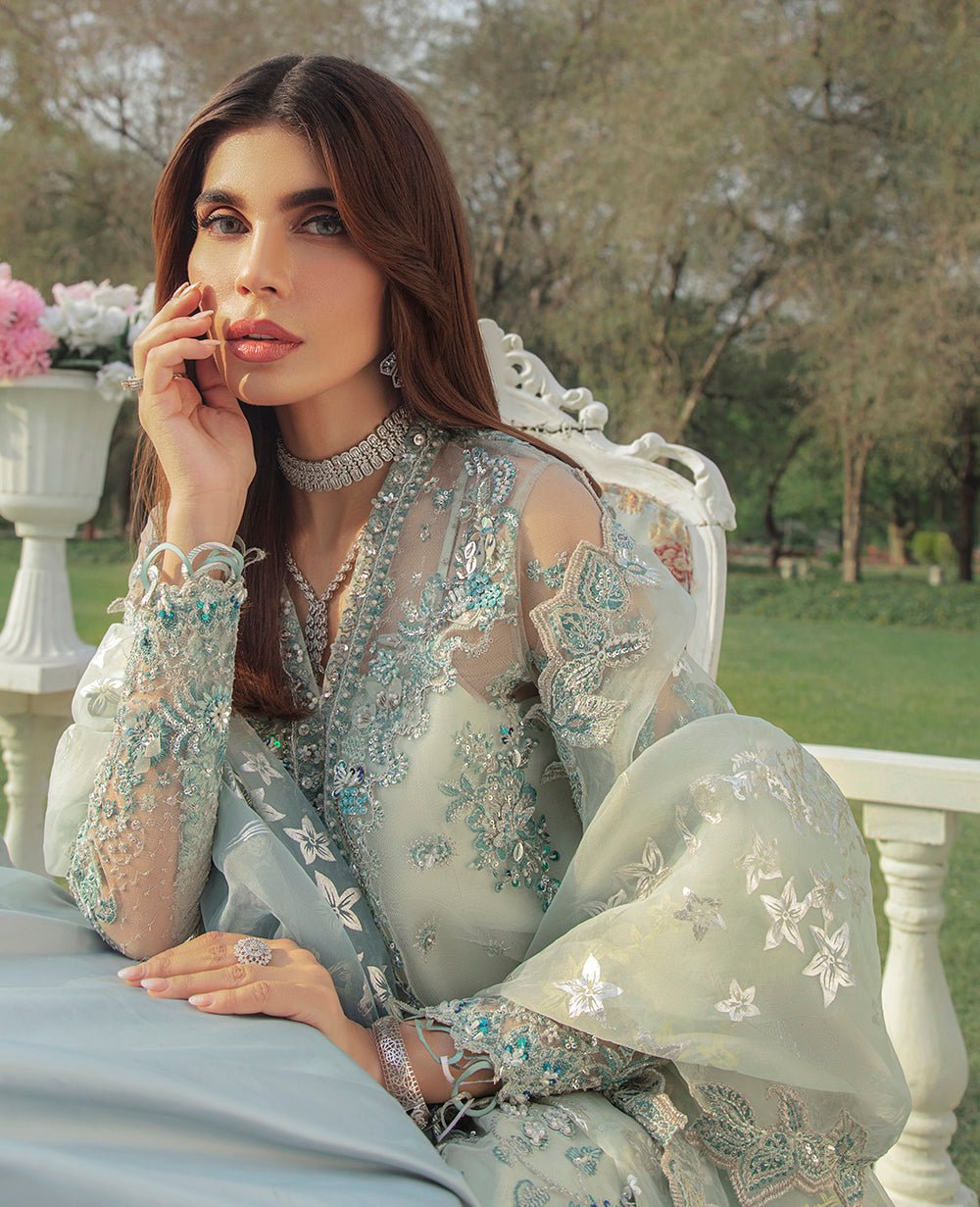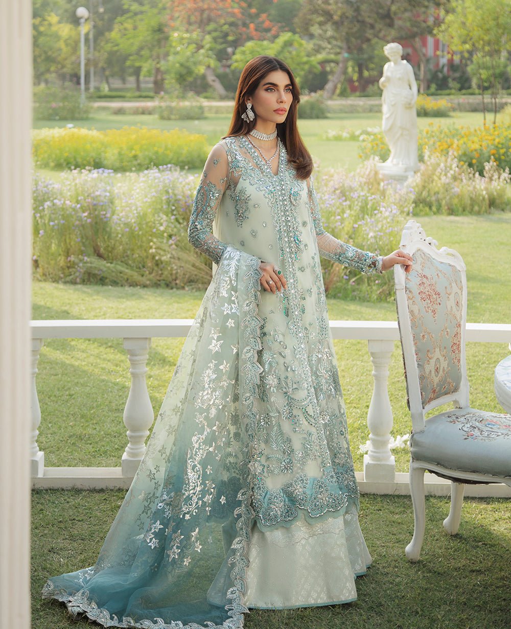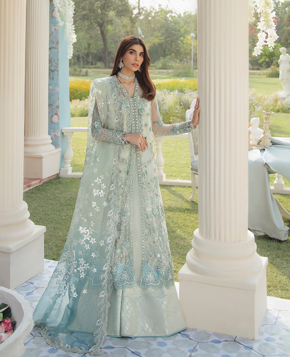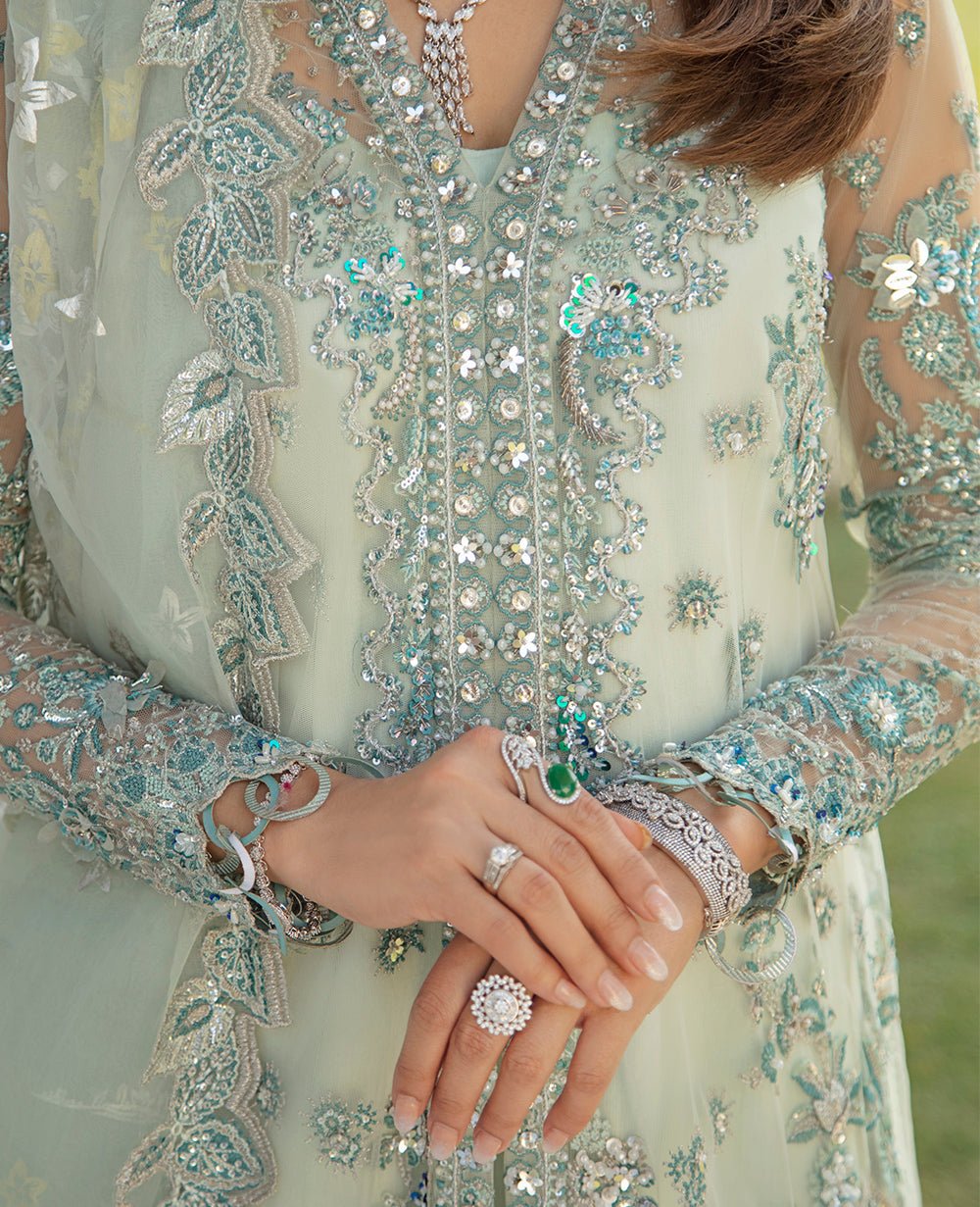 A dreamy net A line jacket with handwork crystals and Swarovski. This pastel ensemble of mint green and shimmery silver comes with an under slip. Complete with silver badla jacquard vintage floral pants and an ombre dyed organza dupatta