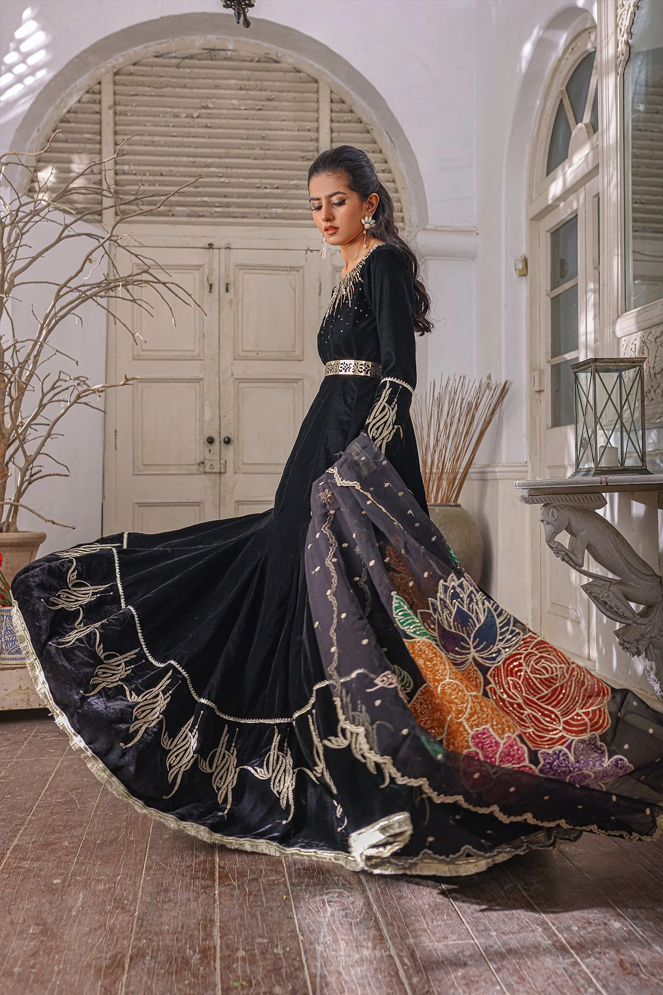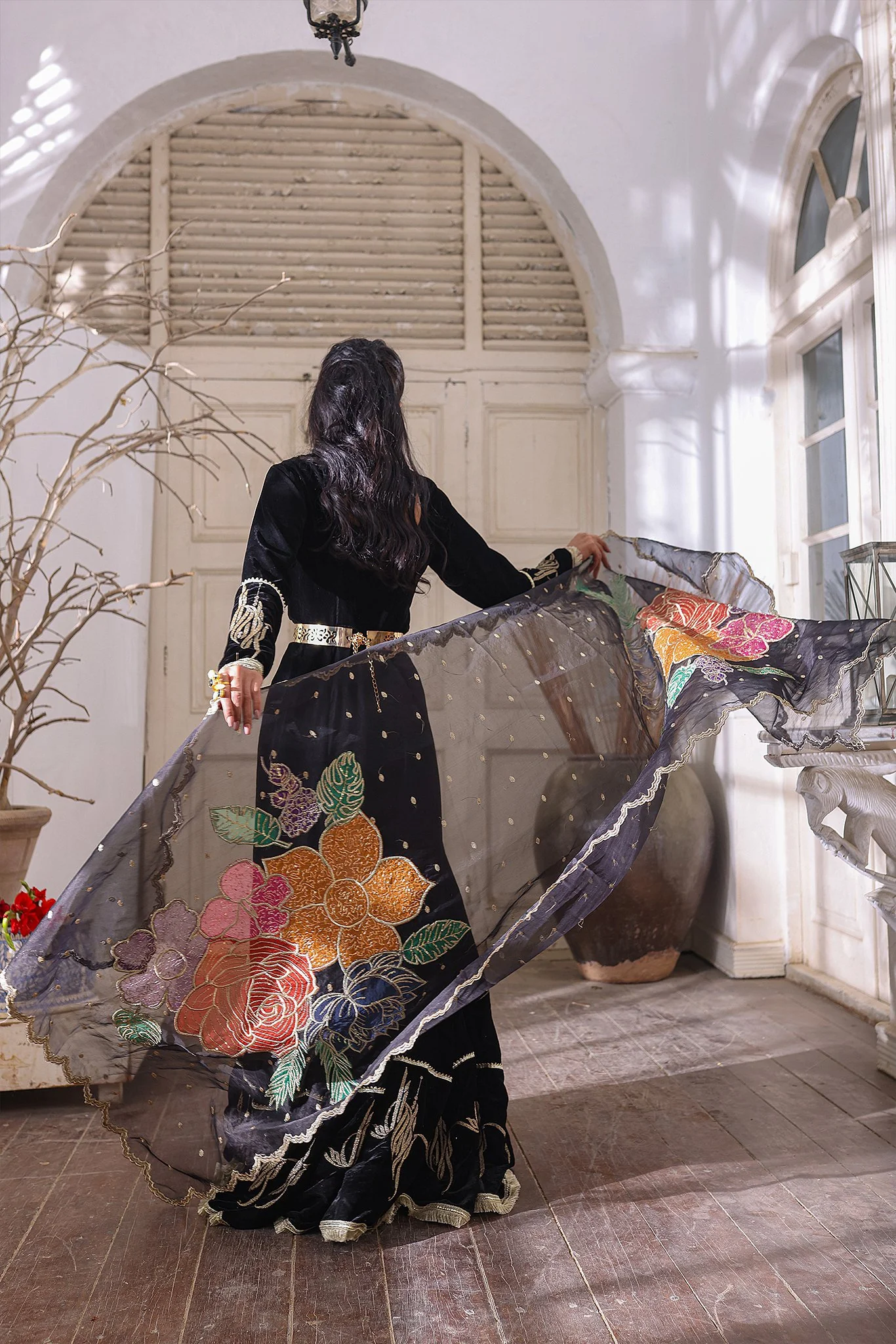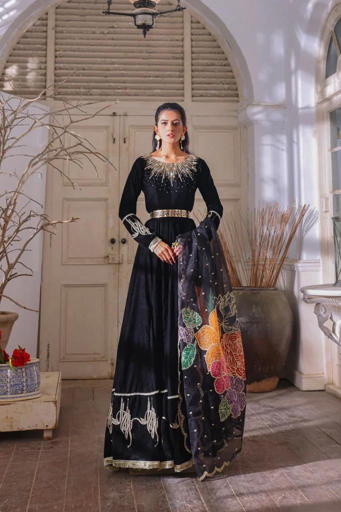 Be the epitome of elegance with our black velvet frock and dupatta. This 9000 micro velvet frocl boasts a delicately hand embroided neckline and dupatta with enticingly zari embroidery and patch work.