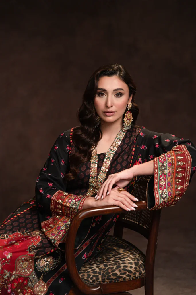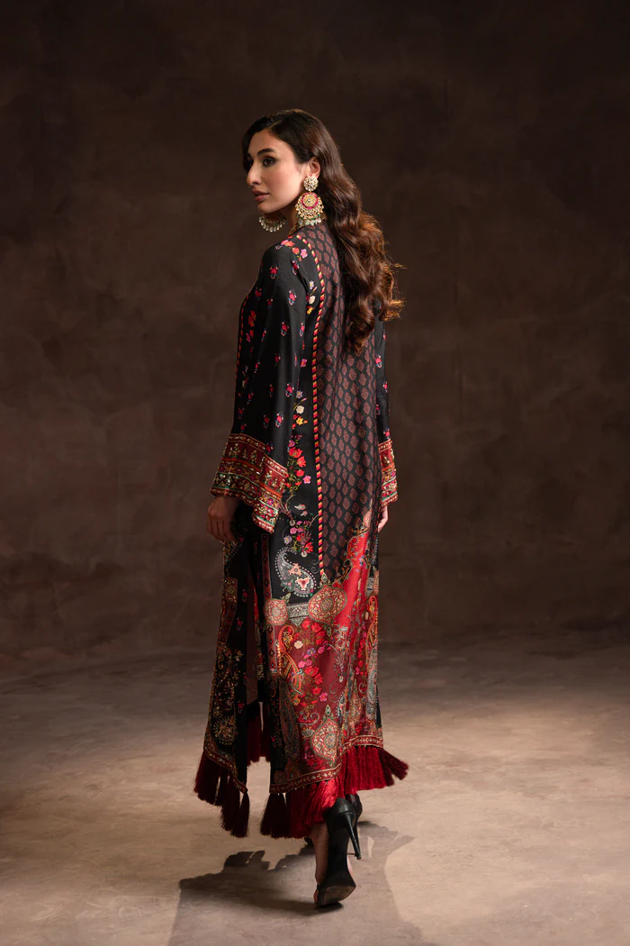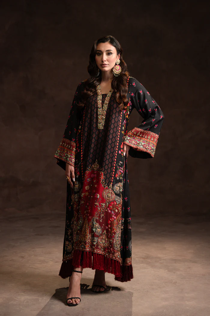 Black is never a let down and this stunning kaftan tunic with multi tassel detailing on the ends is just Wow! The ghera neckline and sleeves are highlighted with our exquisite hand embellishment in shades of gold. The flowy cut lends an aura of sophistication to this unique design. AK prints and our luxe hand made details are sure to set you apart in inimitable style.