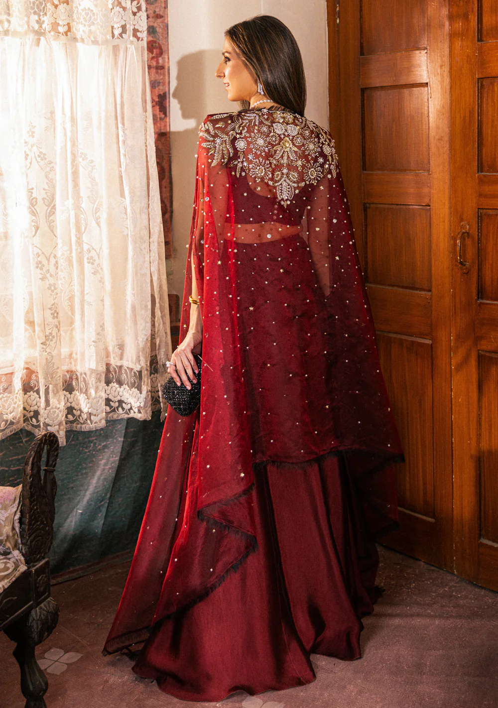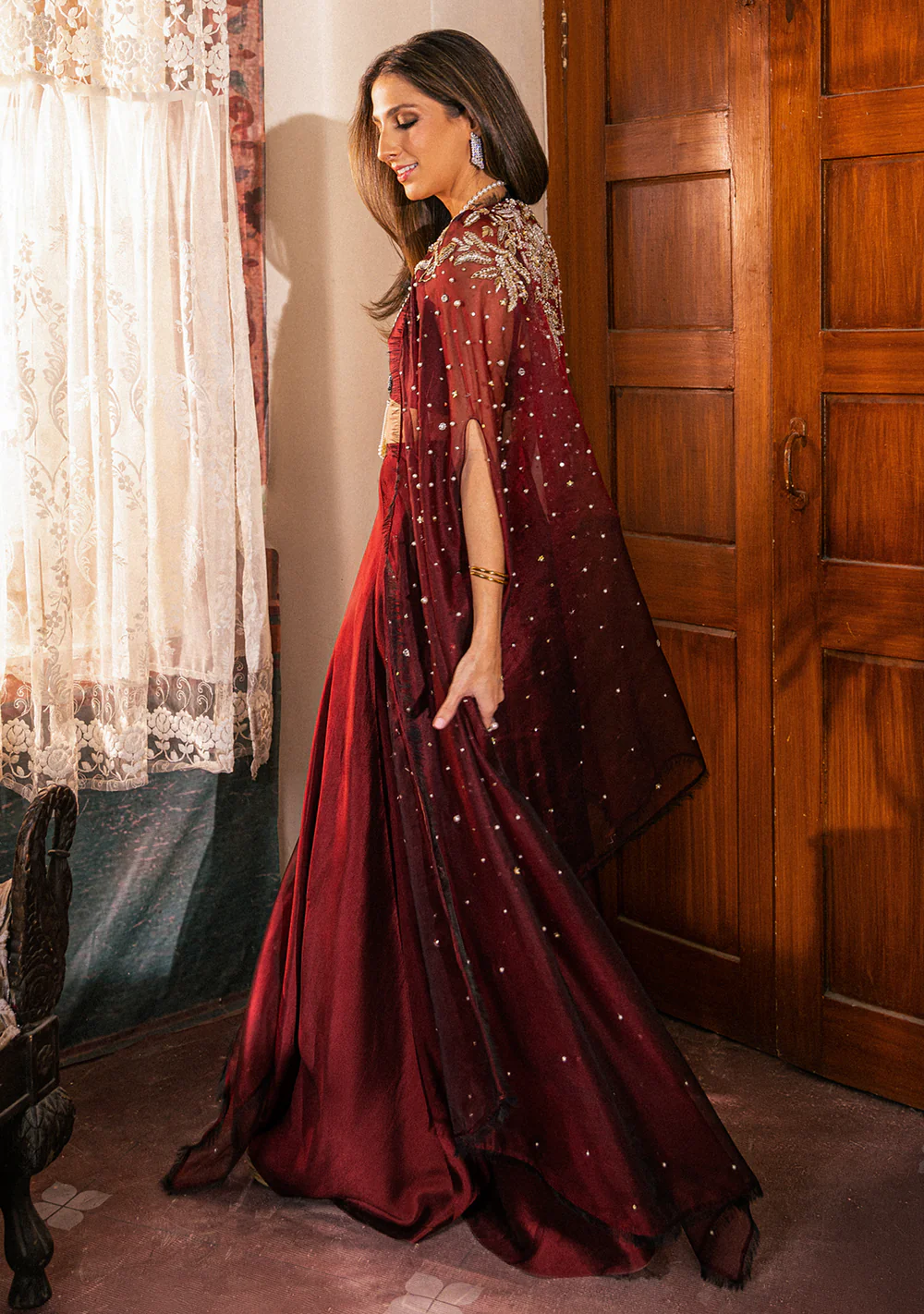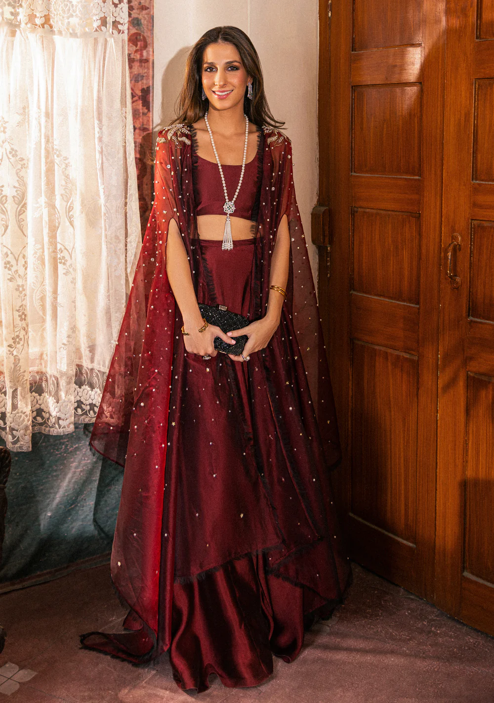 Nahzin, the maroon ensemble comes with an embellished organza cape paired with a flowy lehnga and choli in sheesha silk.